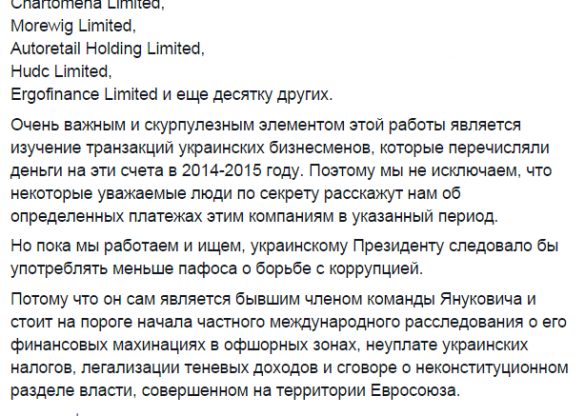 «Но пока мы работаем и ищем, украинскому Президенту следовало бы употреблять меньше пафоса о борьбе с коррупцией. Потому что, он сам является бывшим членом команды Януковича и стоит на пороге начала частного международного расследования о его финансовых махинациях в офшорных зонах, неуплате украинских налогов, легализации теневых доходов и сговоре о неконституционном разделе власти, совершенном на территории Евросоюза», — написал юрист.