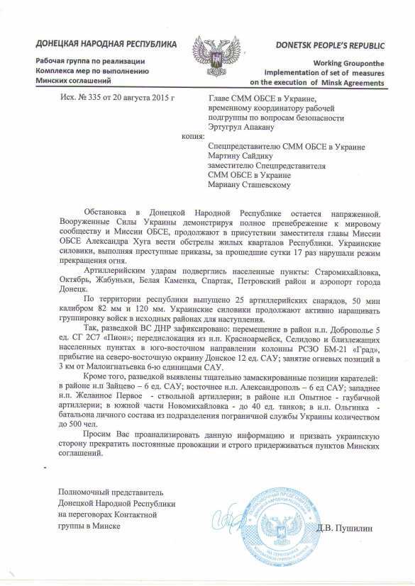 В правительстве ДНР «Русской Весне» предоставили документы, в которых Полномочный представитель ДНР на переговорах Контактной группы в Минске Денис Пушилин обращается к Главе СММ ОБСЕ в Украине Эртугрулу Апакану и Спецпредставителю СММ ОБСЕ в Украине Мартину Сайдику с просьбой приложить усилия для того, чтобы прекратить провокации с украинской стороны и вернуть Украину в рамки Минских соглашений.