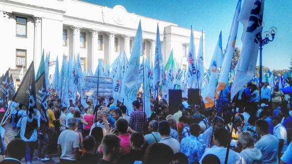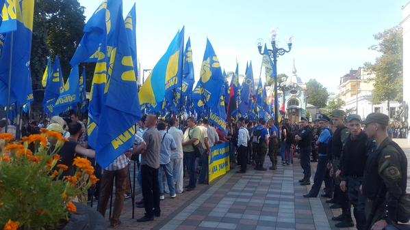 Сейчас у здания Верховной Рады собралось около тысячи человек. Они выступают против изменений в Конституцию.