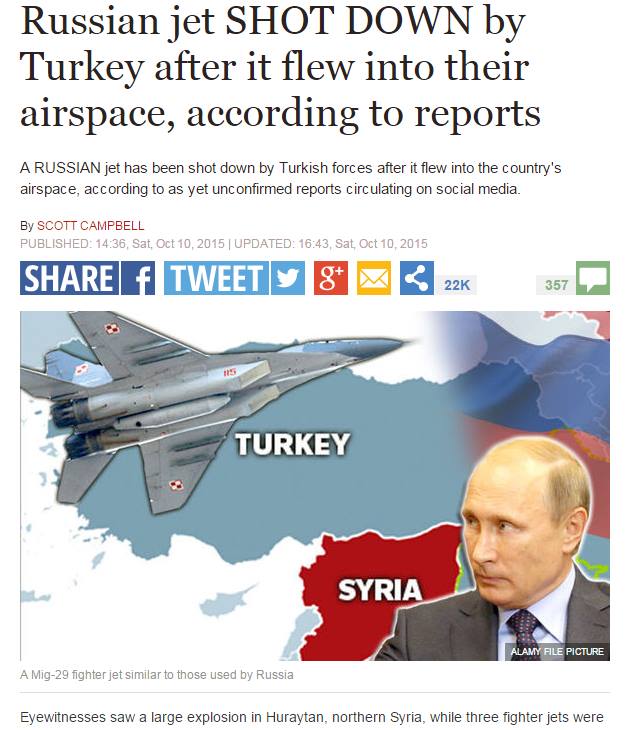 Ранним утром 10 октября сразу несколько британских информагентств сообщили о том, что турецкие ВВС сбили российский истребитель МиГ-29, нарушивший воздушное пространство ближневосточного государства.