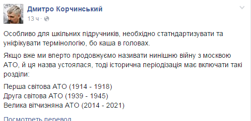 Дмитрий Корчинский (ставший теперь Дмитро Корчиньским), один из основателей УНА-УНСО и живая икона украинского национализма, предложил переименовать Вторую Мировую (и, соответственно, Великую Отечественную) войну в «АТО».
