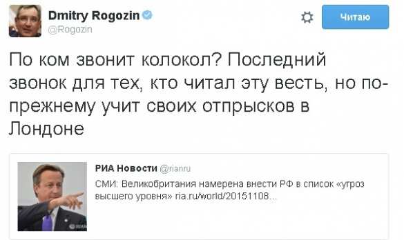 «По ком звонит колокол? Последний звонок для тех, кто читал эту весть, но по-прежнему учит своих отпрысков в Лондоне», — подчеркнул Рогозин.