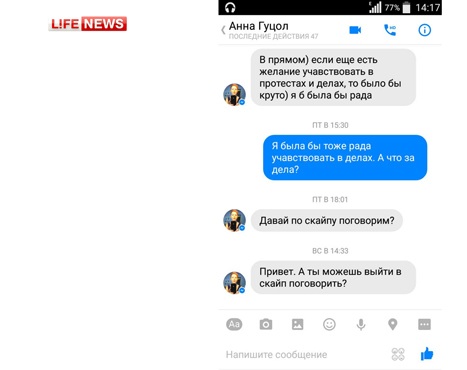 «Есть вливания. Финансовые вливания. Есть возможность поднять на новый уровень движение и получать до штуки (тысячи долларов. — Прим. ред.) за одну акцию. Готова ли ты принимать в этом участие, можешь ли ты кого-то из девчонок ещё подключить?» — поинтересовалась Гуцол в телефонном разговоре с одной и активисток.