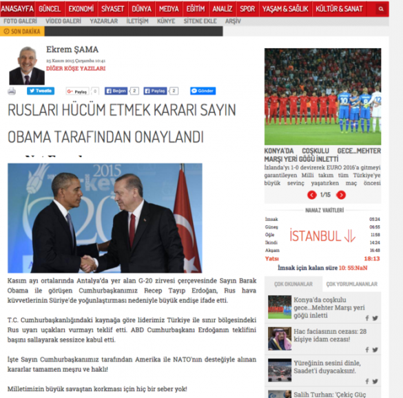 «Источники, близкие к администрации турецкого президента, цитируют Эрдогана, который на встрече с Обамой предложил ему в целях предупреждения России сбить российский самолет. Минуту подумав, Обама кивнул», — заявляет издание.