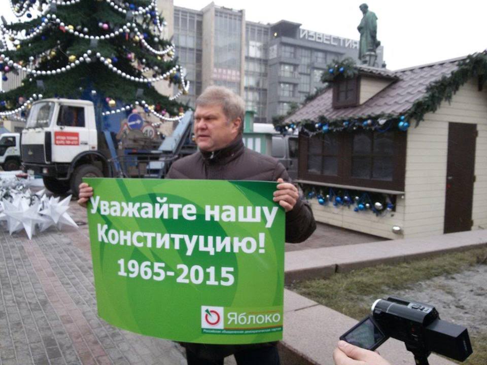 Председатель «Яблока» Сергей Митрохин принял решение выйти на одиночный пикет, после того как ранее на этой неделе ему было отказано в проведении масштабного митинга. «Мы защищаем нашу Конституцию, потому что считаем, что к ней относятся как к половой тряпке, вытирают о нее ноги», — заявил Митрохин журналистам.