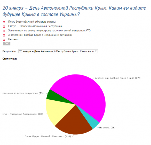 Читателям предлагалось избрать несколько вариантов будущего полуострова в составе Украины — заселить его «ветеранами АТО», предоставить статус крымскотатарской автономии, сделать обычной областью Украины.