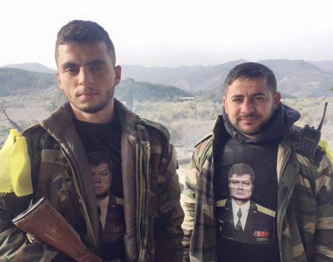Бойцы сирийского ополчения — Сил Национальной Обороны и солдаты правительственных войск, воюющие на Севере мухафазы (провинции) Латакия, носят футболки с портретом расстрелянного пилота сбитого турками Су-24 — Героя России, подполковника Олега Пешкова.