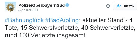 Немецкие СМИ сообщают о 8-ми погибших и около 150-ти пострадавших. Такие данные они приводят со ссылкой на представителей полиции города Розенхайм (Rosenheim) и спасательных служб. В свою очередь официально пока сообщается о смерти 4-х и ранении 100 человек.