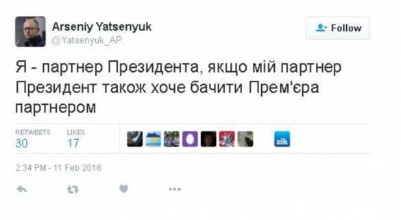 «Я — партнёр президента, если мой партнёр президент тоже хочет видеть премьера партнёром», — написал Яценюк.