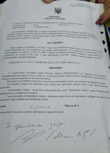 «В удовлетворении искового заявления Писного Василия к Парасюку Владимиру о защите чести, достоинства, деловой репутации, опровержения неправдивых сведений и возмещении морального вреда отказать», — говорится в постановлении суда, фото которого нардеп разместил на своей странице в Facebook