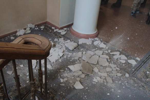 Как сообщают местные СМИ, обвалившийся кусок штукатурки был достаточно большим, чтобы навредить кому-нибудь из присутствующих в здании, но обошлось без пострадавших.