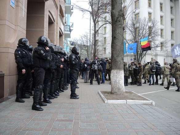 В центре Киева около здания МИД УКраины на ул. Десятинной националисты, утром принявшие участие в мероприятиях на Майдане Незалежности, штурмуют офис компании СКМ, принадлежащей опальному донецком олигарху.