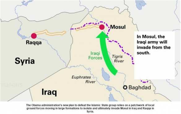Сейчас, согласно «революционному стратегическому плану» американского командования, отрезанный и блокированный Мосул должен быть взят в кратчайшие сроки. Для этого большое количество иракских войск уже дислоцированы в зонах, расположенных на юго-запад от столицы Курдистана, Эрбиля, и продолжают принимать конвои с вооружением и техникой, направляемые США и состоящие из танков, бронемашин, артиллерийских установок и грузовиков с боеприпасами. 15-я бригада армии Ирака, на базе которой планируется развернуть штурмовую группировку, по состоянию на 19 февраля уже приняла три таких тяжелых конвоя. С севера блокирование Мосула осуществляется курдскими отрядами пешмерга, а перекрытие транспортных путей к городу осуществляется как курдами, так и авиацией коалиции.