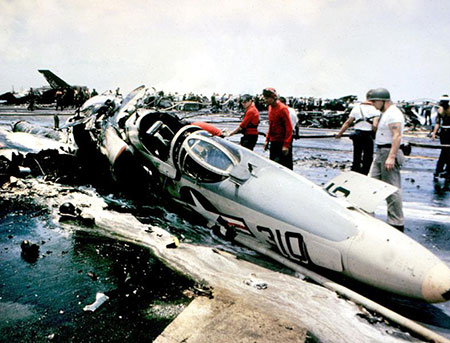 Но и тут Маккейну не везет — в одном из полетов доблестный рыцарь звездно-полосатых ВВС умудрился «размотать» истребитель, зацепившись за опору линий электропередач. И снова везение — сам не пострадал, ответственности не понес. Однако, самая интересная страница в биографии Джона Маккейна — его служба на авианосце «Форрестол». Вину за происшествие, благодаря которому авианосец надолго был выведен из строя, многие военные историки приписывают именно нашему герою. «Официально, конечно, причиной взрыва назвали техническую неисправность», — поясняет военный историк Борис Литвинов.