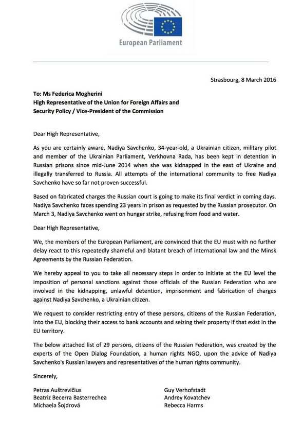 Письмо, подписанное 57 парламентариями, перечисляет тех, кто, по мнению евродепутатов, «ответственны за политическое решение о похищении Савченко, транспортировке ее на территорию России, незаконное ее задержание и предъявление сфабрикованных обвинений».