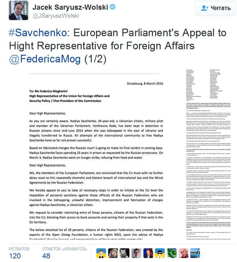 Обращение выложил в своем Twitter польский евродепутат Яцек Сариуш-Вольский.