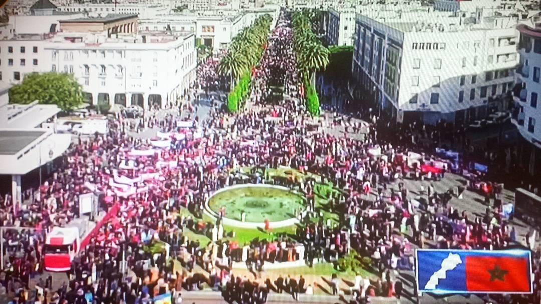 Выразить свой решительный протест в центре Рабата, по подсчётам организаторов, собрались более 2 млн человек. Участники митинга размахивают марокканскими флагами.