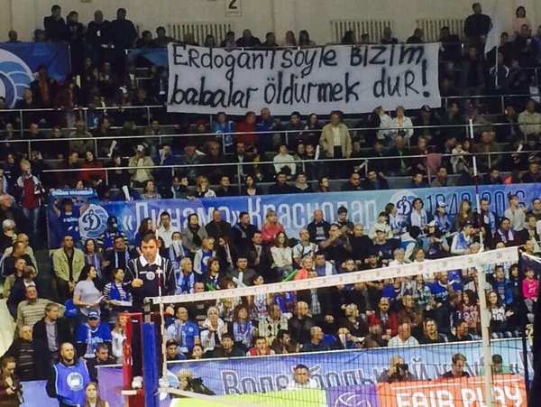 Во время матча болельщики на некоторое время растянули на трибуне плакаты на русском и турецком языках, которые гласили: «Скажите Эрдогану, чтобы больше не убивал наших отцов!»