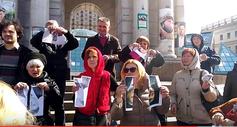 После этого выступления началось представление с портретами Порошенко — два десятка мужчин и женщин принялись рвать портреты президента Украины Петра Порошенко.