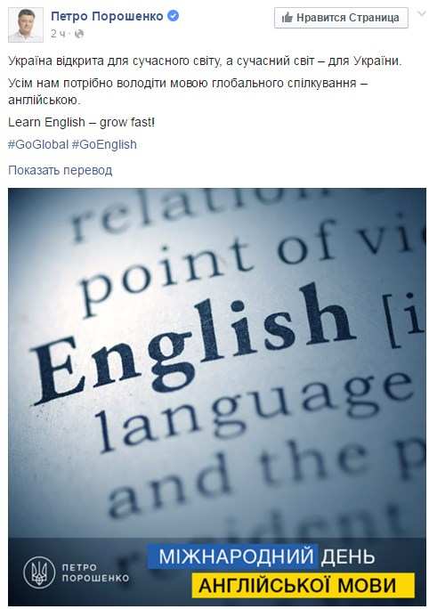 «Украина открыта для современного мира, и современный мир — для Украины. Всем нам нужно владеть языком глобального общения — английским. Learn English — grow fast (Учи английский — расти быстро)», — пишет Порошенко.