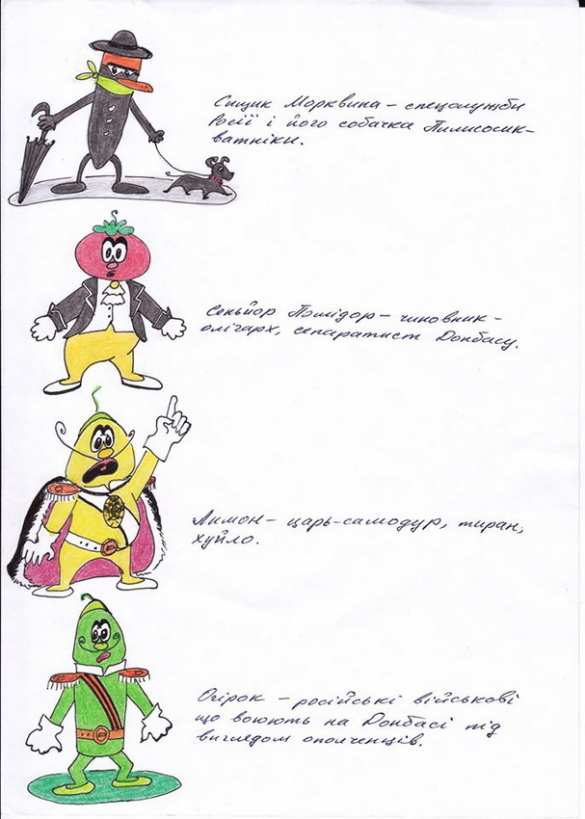 По версии Савченко, сыщик Морковка олицетворяет спецслужбы России как и его его собачка Пылесосик-ватник.