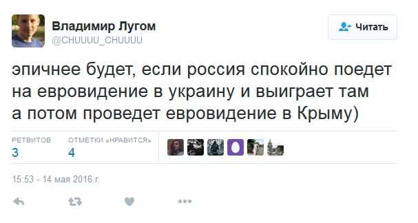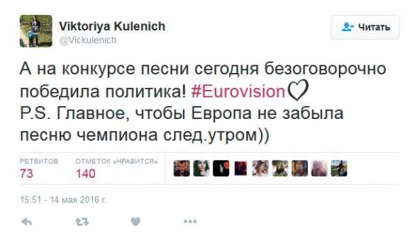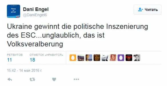 «Украина выигрывает политическую постановку «Евровидение»… Невероятно... это одурачивание народа», — написал в Twitter пользователь Дэни Энджел (Dani Angel) из Германии.
