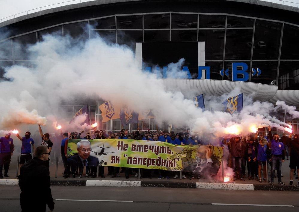 Возле терминала «В» экстремисты развернули плакат с надписью «Не убегут, как предшественники». Позже участники акции зажгли файеры.