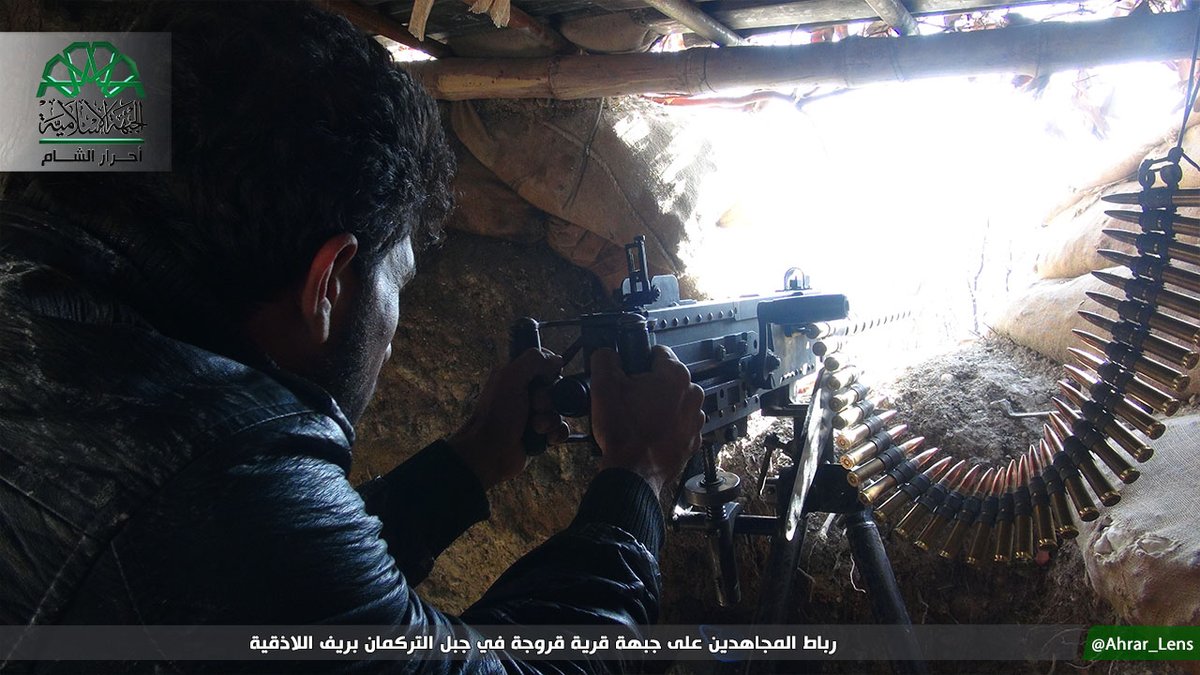 На главном фото: пулеметчик «Ахрар аш-Шам» в Латакии, на фото внизу — зенитка «Джебхат ан-Нусры» ведет огонь в Латакии, а также гаубица Д-30, пулеметы и ПТУР TOW боевиков ССА в Алеппо и др. провинциях.