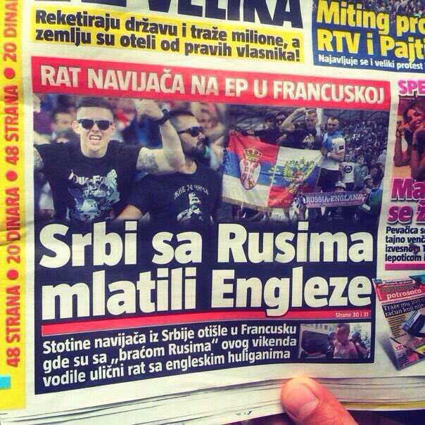 В сербских СМИ вышел материал о том, что немало фанатов из бывшей Югославии приехали во Францию поддержать русских братьев в уличных столкновениях с британскими «ультрас». Эту информацию «Русской Весне» подтвердили и в околофутбольном сообществе.