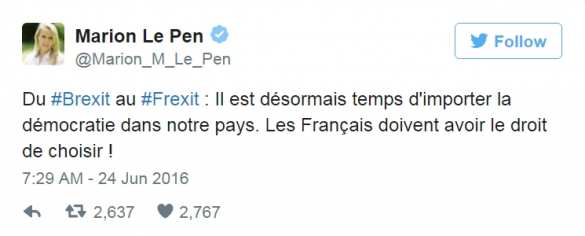 «От брексита к фрекситу: теперь время привнести демократию в нашу страну. У французов должно быть право выбора!» — написала она в Twitter.