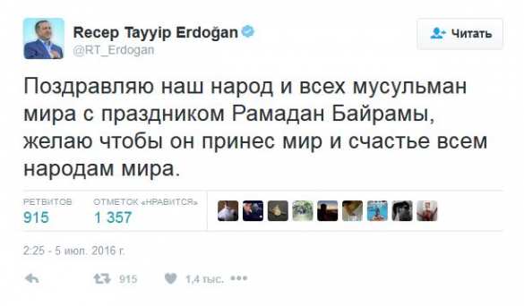 При этом на официальной странице турецкого президента в Twitter появилось поздравление и на русском языке.