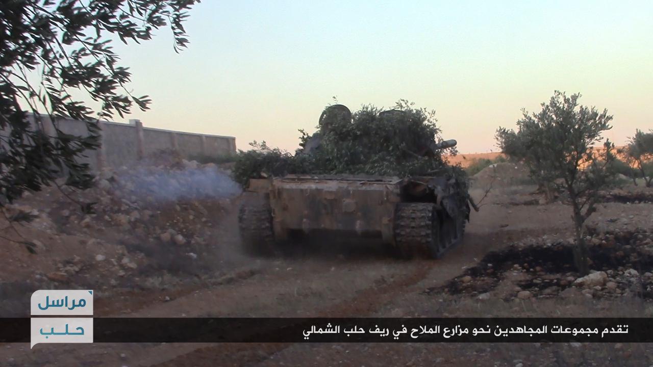 В Алеппском котле боевики не прекращают атаки на позиции правительственных войск для деблокирования дороги Кастелло у ферм Маллах. При этом они несут существенные потери и не могут добиться успеха. 13 июля при провальном наступлении они потеряли более 20-ти боевиков, 2 танка, несколько БМП и пикапов с пулеметами.