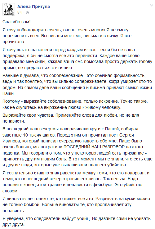 Я сознательно ставлю знак равенства между теми, кто его подорвал, и теми, кто в последний вечер отравил его жизнь. Так нельзя. Надо положить конец этой травле и ненависти в фейсбуке. Это убийство словом.