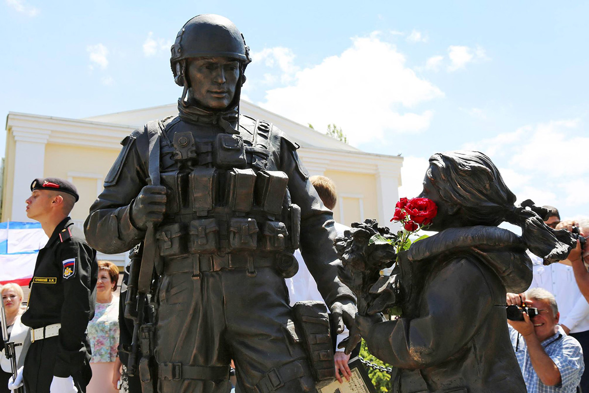Сам памятник представляет скульптуру из бронзы: юная крымчанка дарит букет цветов двухметровому бойцу в форме и с автоматом на плече. Открытие памятника приурочили ко Дню России, 12 июня.