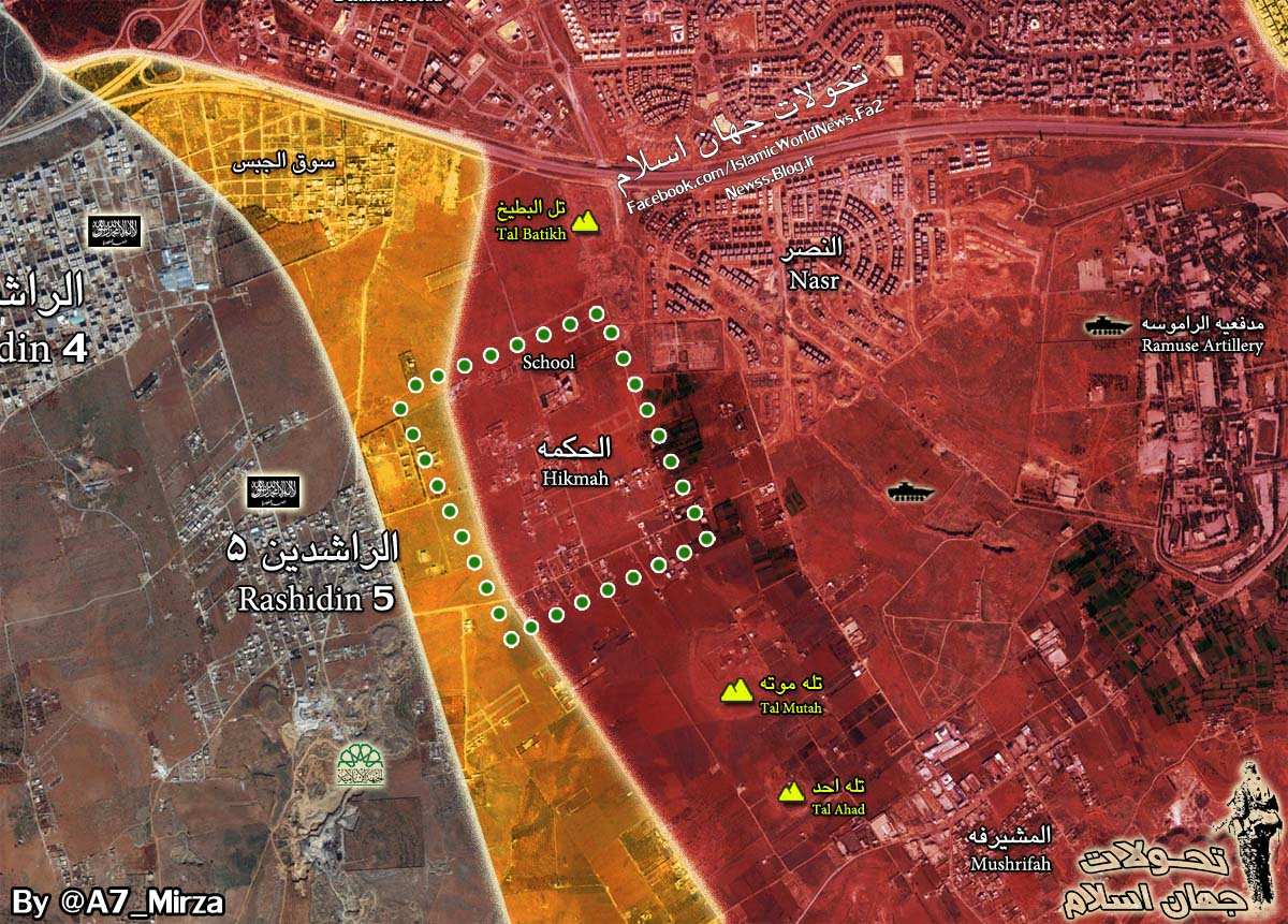 Террористы-смертники взорвались вблизи позиций Сирийской Армии в районе Алеппо. Огромные столбы дыма и огня поднялись над Алеппо, и бандиты ринулись в наступление. Один из начиненных взрывчаткой «джихадмобилей» взорвался у школы Аль Хикма в районе Аль-Рашидин.