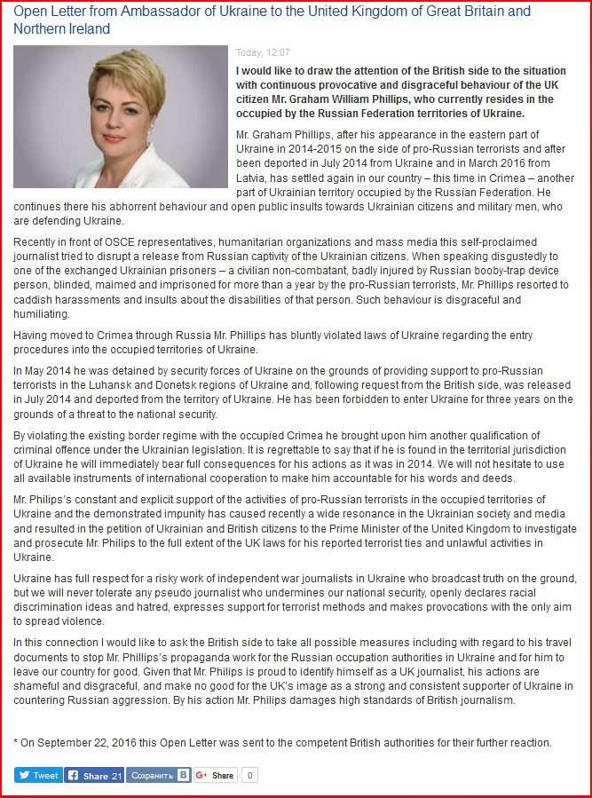 «Украинское правительство официально жаловалась на меня правительству Великобритании — вот настолько они ненавидят правду! — пишет Филлипс, сопровождая свои слова скрином открытого письма от посольства Украины (см. ниже). — а я работаю, как и всегда. Луганск только что.