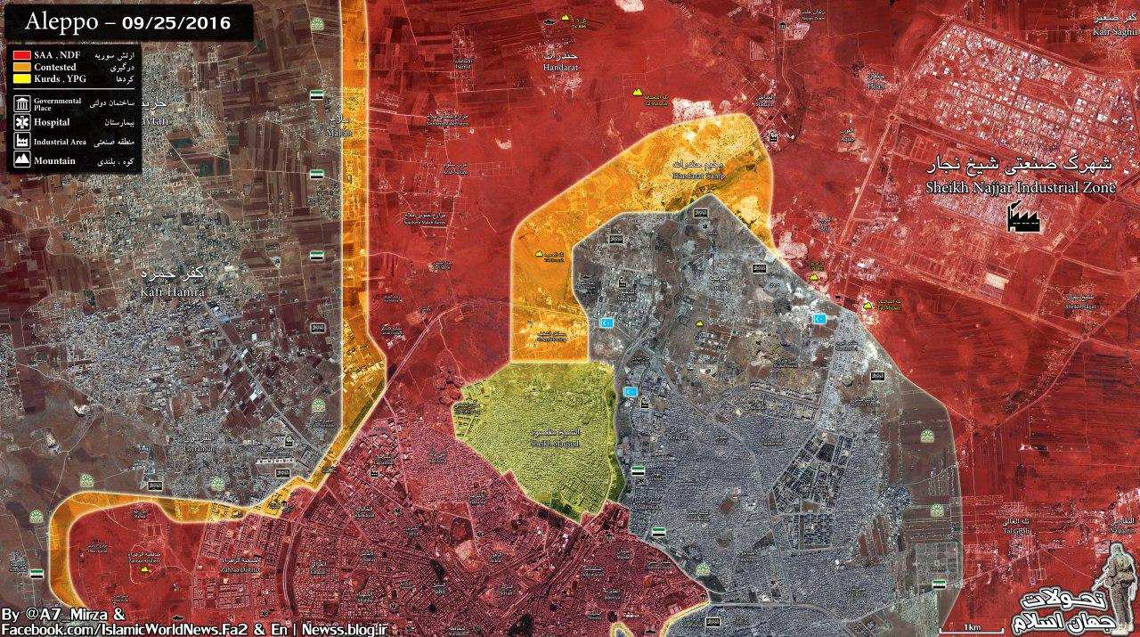 В воскресенье 25 сентября на юго-западной окраине лагеря палестинских беженцев Хандарат в Алеппо правительственным войскам удалось выбить боевиков с занимаемых позиций в хорошо оборудованных огневых точках и продвинуться вперёд на 300 метров на северной окраине.