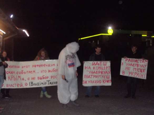 Участники акции держали плакаты: «Идешь на концерт „Ундервуд“ — поддерживаешь оккупацию Крыма», «Рашистам с „Ундервуда“ не место в Украине» и другие. Входящих в паб они называли «ватой».