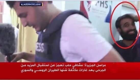 На видео журналист Al Jazeera проходит по помещению, представленном как отделение экстренной помощи раненым. В камеру попадают медики и жители города, якобы травмированные во время атаки самолетов ВКС России. На миг в кадре появляется улыбающееся лицо мужчины (00:06 сек), не подозревающего, что его снимают. Быстро сориентировавшись, «пострадавший» прячет улыбку и делает «страдающее» выражение лица. Следует отметить, что «раненый» заранее был готов к съемке, картинно держась за голову и живот, но не рассчитал время своего попадания в камеру.