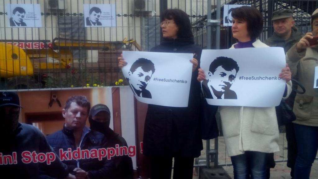 Протестующие держат плакаты: «Я тоже корреспондент. Свободу Роману Сущенко!», скандируют: «Свободу Сущенко». Кроме того, «активисты» прикрепили к ограде дипмиссии плакат с изображением Сущенко в наручниках и надписью: «Kremlin! Stop kidnapping!» («Кремль! Прекрати похищения!»).