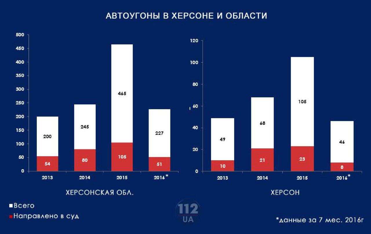 «В Киеве в 2013 г. было открыто 555 уголовных производств по факту угонов, из них правоохранители раскрыли 146. В 2014 г. полиция зафиксировала 1662 угона, из которых раскрыла 176. В 2015 г. на территории столицы, по данным полиции, угнали 1957 машин, раскрыли 226 угонов. За 7 месяцев 2016 г. были угнаны 1105 авто, раскрыли 130 угонов.