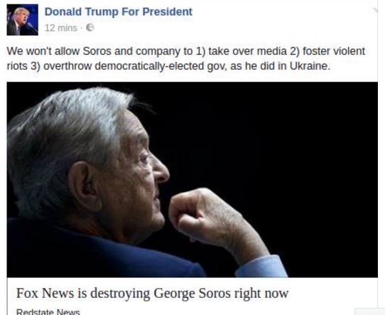 На официальной страничке штаба сторонников Дональда Трампа в социальной сети Facebook (более двух с половиной миллионов подписчиков) вчера вечером появилась интересная запись, свидетельствующая о том, что его команда не только не приветствует свержение Януковича в феврале 2014, но и считает это крайне деструктивным событием, инициированным транснациональным олигархом Соросом.