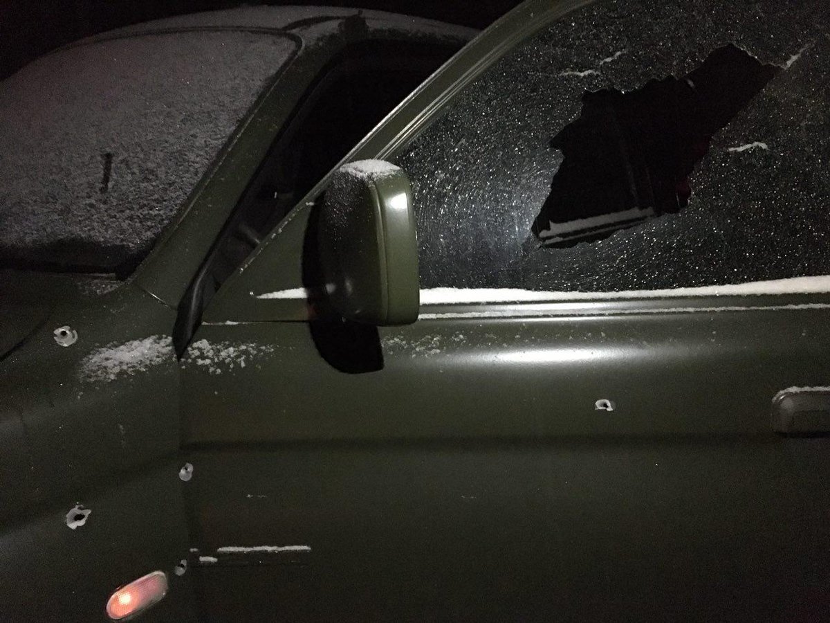 Опубликованы и фото, судя по которым, стреляли отнюдь не из какой-нибудь малокалиберной винтовки или травмата — в стекле машины рядом с водителем зияет огромная дыра.