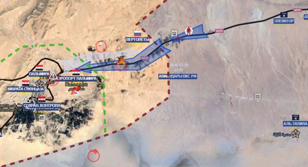 Как ранее сообщала «Русская Весна», в контрударе приняли участие более 20 ударных вертолетов и 6 боевых самолетов. В настоящее время они продолжают ровнять с землей позиции ИГИЛ вблизи Пальмиры. Активное участие в операции приняли ударные вертолеты Ми-28Н «Ночной охотник», «Аллигаторы» Ка-52 и модернизированные Ми-35. Многофункциональные истребители ВКС России Су-34 и Су-35 с авиабазы Хмеймим также весь вечер работали у древнего города.