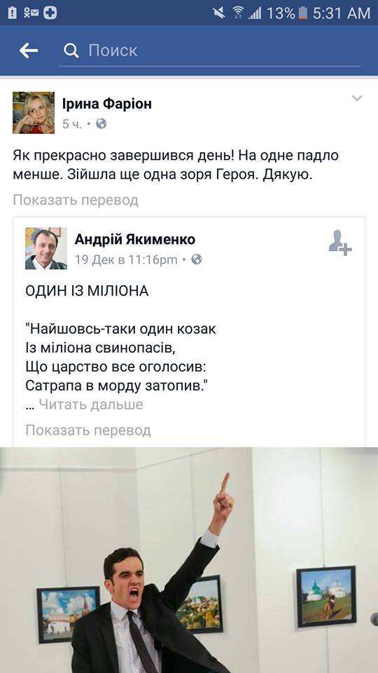 Его восторг разделяет львовская землячка, известная «патриотка» Ирина Фарион: «Как прекрасно завершился день. Еще одной падлой стало меньше. Взошла новая звезда Героя». Бывший народный депутат Тарас Чорновил написал, что турецкий террорист «своим выстрелом спас много жизней граждан Украины».