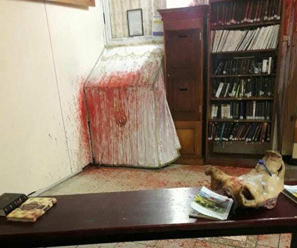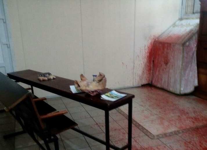 Погромщики забросали помещение кусками свинины, бросили в помещении свиную голову с вырезанной на ней свастикой и забрызгали пол и стены красной краской.