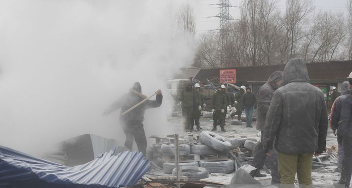 Около баррикад предприниматели разложили шины и подожгли их. Позже баррикады начали штурмовать люди в камуфляже.