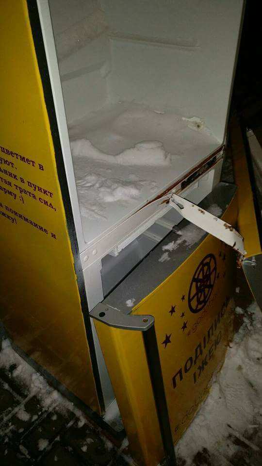 В Киеве возле метро «Академгородок» варварски ограбили и сломали последний холодильник с едой для бедных.