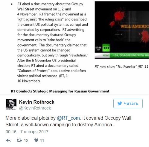 «Новые дьявольские заговоры @RT_com: они освещали Occupy Wall Street, известную кампанию по уничтожению Америки», — иронизирует Ротрок.