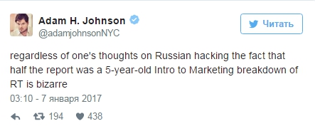 «Независимо от того, кто что думает о русских взломах, тот факт, что половина доклада является вступлением к рекламной кампании RT пятилетней давности, смотрится странно», — написал в Twitter журналист Адам Джонсон.